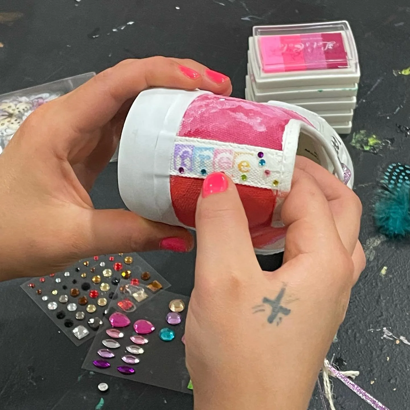In These Shoes is a project imagined and led by Wild Vision Collective in partnership with Arc Stockton, RoC Solid Housing, Nightlight Theatre and Wellington Square, Stockton. With funding from the National Lottery, we, Wild Vision Collective, delivered a series of art workshops with women who have a range of vulnerabilities including care leavers, poor mental health, prison leavers and those recovering from addiction. The workshops, based on the theme of shoes, as a tool to help the women tell their stories, giving them a voice, building their confidence and sense of self-worth. The project culminated in an exhibition located in an empty shop, transforming it into a ‘Shoe Shop’ displaying the creations of the participants.
